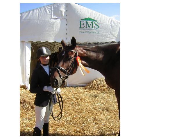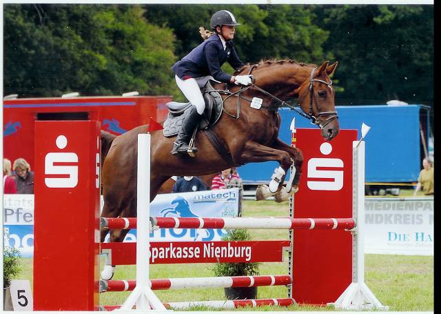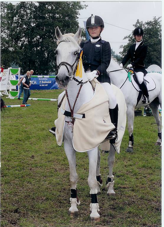 Clara (Jahrgang 1995) mit Ausbildungspferd Fine Lady 6-j�hrig von Fabriano-Weltmeyer. Platziert bis Klasse -L-Kandarre und hier siegreich im August 2007 in Zobbenitz mit Clara in einer E-Dressur mit Wertnote 7,6